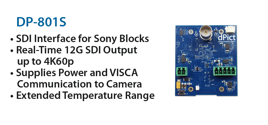 dPict Imaging Sony interface boards support Sony Block Cameras and supply various video ouputs such as HDMI, SDI, or Ethernet.